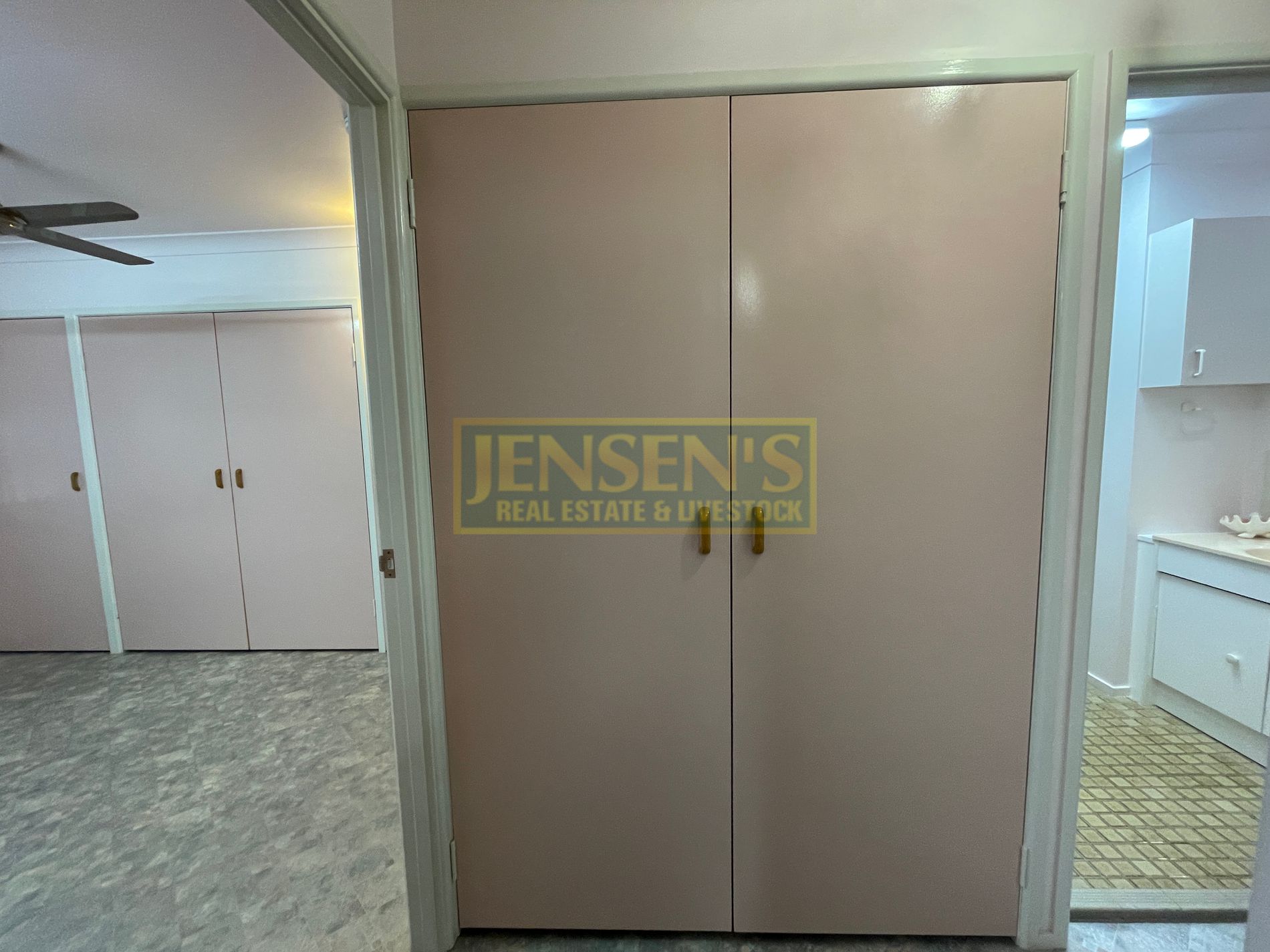 The main bedroom features a five-door built-in wardrobe and ceiling fan, while the second bedroom includes a two-door wardrobe, ceiling fan, and box air conditioning – perfect for family visits or a home office. A double-door linen cupboard in the hallway adds even more practical storage.